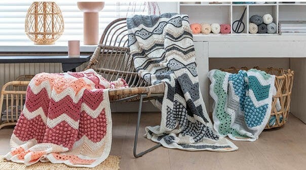 Ups 'n Downs 2021 is vanaf aanstaande maandag als pakket verkrijgbaar in drie kleurvariaties: Grey Sand, Pink Beach en Blue Wave. De Ups 'n Downs wordt aangeboden als compleet pakket met voldoende garen voor het gehele project, leren label als finishing touch en een doosje stekenmarkeerders. Er wordt gehaakt met Durable Cosy extra fine en haaknaald 3.5 mm.